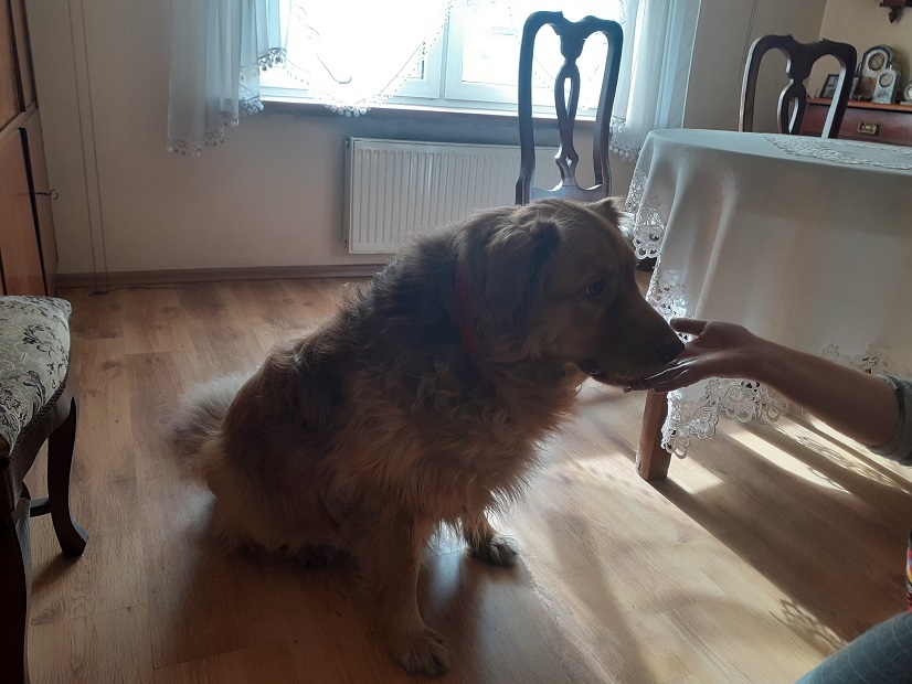 Problemem jest jednak wciąż strach. Zaprzyjaźniła się ze mną. Od pewnego czasu muszę podpierać się kulą. Kula ma to do siebie, że jak się ją postawi to lubi się przewrócić i narobić przy tym hałasu. I tak się przypadkowo stało. Karmelia się przeraziła, uciekła na górę i przestała mi towarzyszyć przy śniadaniu. Przed tym wypadkiem wręcz żebrała o najmniejszy kawałeczek pożywienia. Problemem jest jedzenie. Podobno goldeny (a ma w sobie jakąś część goldena) mają bardzo delikatne żołądki. Tylko i wyłącznie gotowa karma i to specjalnie dobrana.