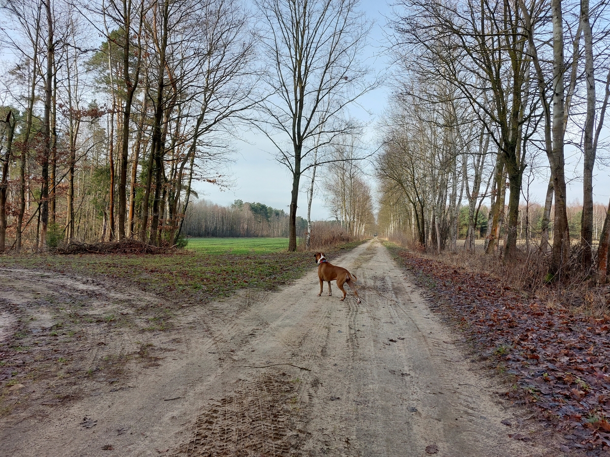 Na wstępie zaznaczę, że  to las prywatny i jedyna możliwość aby pies mógł się wybiegać po polach :).  To bardzo mądry i inteligentny pies przez co udało się go dobrze ułożyć w pełnym tego słowa znaczeniu. Bardzo posłuszny, dobrze zsocjalizowany i reaguje na każde zawołanie, na przestrzeni wspólnych 6 lat od szczeniaka niejednokrotnie miałem sytuacje, właśnie w lesie, napotykania różnorodnej zwierzyny i jeszcze się nie zdarzyło aby uciekł. Jak zauważysz na tych fotkach w tle stado łań i jeleni stąd taka postawa psiaka ale nie odważyła się pobiec 😉