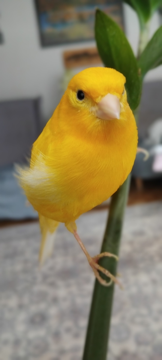 Podczas pierzenia był mocno osłabiony i choroba zaatakowała oczy. Mimo słabego wzroku bardzo dobrze sobie radzi, w klatce bez problemu znajduje karmidelka. Po pokoju próbuje czasem latać ale to tak max 2 metry i zaraz siada na podłogę. Ogólnie jest w świetnej formie, śpiewa i piękne wygląda 😀