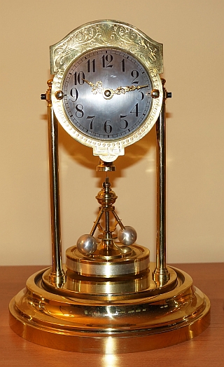 The 400 day duration movement (because it only needs winding once every 400 days) with a Dead-beat escapement. Behind a 3 1/2" diameter cream enamel dial with Arabic numerals and brass bezel. Also with floral brass crest and stood upon a seat plate with two brass pillars and contained under a round glass dome. The movement backplate is stamped with the maker's mark of 'Gustav Becker' and operates a rare 4-ball rotating pendulum.