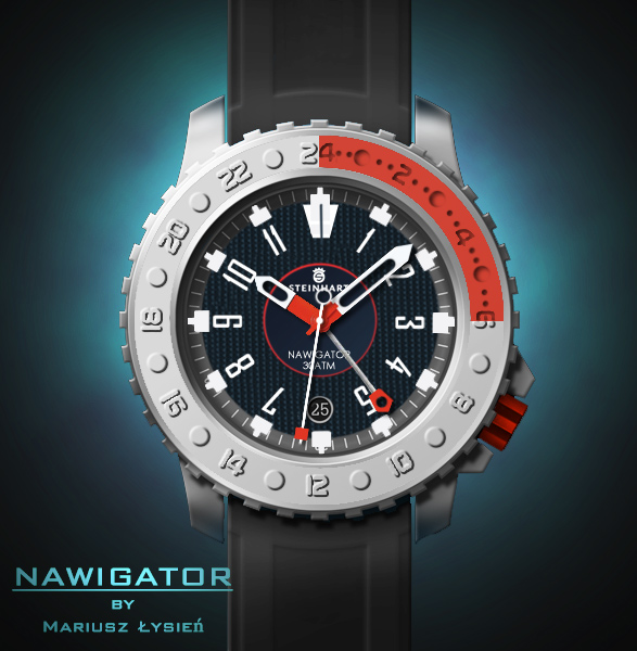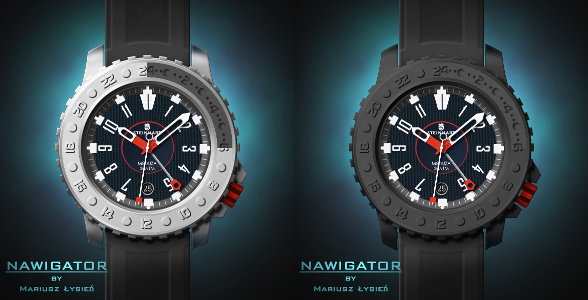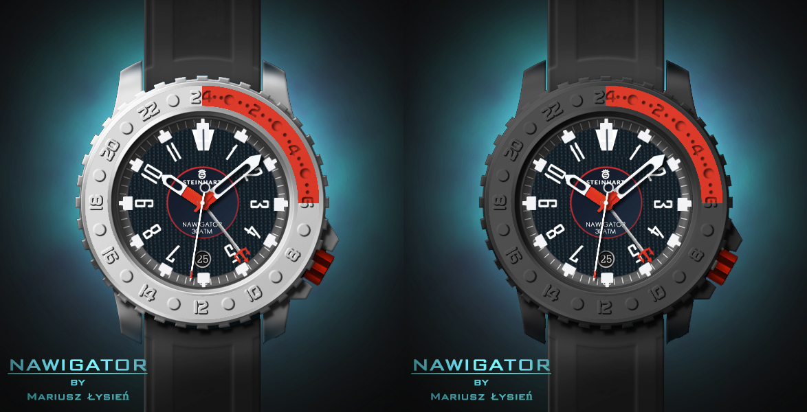 Mariusz jak dla mnie w nawigatorze i żeglarzu nie pasuje mi wskazówka GMT oraz trójząb po drugiej stronie. W pozostałych projektach wydłuż może trochę sekundę od strony trójzębu bo wyglądają jak przykurcze :) Sekundę zakończ bez strzałeczek, kwadracików, po prostu prosta linia ze znacznikiem z luminowej