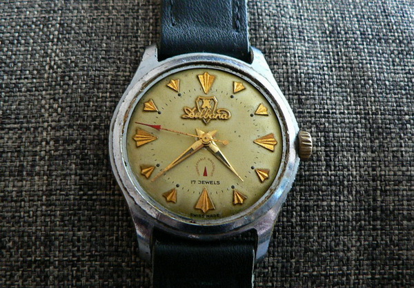 Witam wrzucam tego Mojego Recodmastera , po wymianie szkiełka , naoliwieniu , wymieniona także wskazówka sekundnika , ale dalej trzeba szukać oryginału . Zegarmistrz trochę przeczyścił tarczę , starając się usunąć tą zieloną fleję , ale bał się coś więcej uzyskać aby nie zeszły indeksy i napisy . Co do kolegów ortodoksów postanowiłem że zostaje tak jak jest . Z nowym szkiełkiem i z pół metra nie wygląda tak tragicznie . W skali 5 dam jej 3.