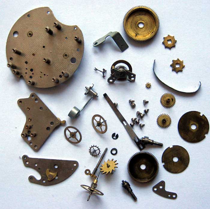 Po rozebraniu okazało się, że brakuje jednego odstępnika tarczy, kilku wkrętów, jeden brak (na mostku kotwicy) widać na zdjęciu ponadto mechanizm zasmarowany ja nieszczęście. Ktoś uznał, że maczanie w oleju uzdrowi mechanizm. Szkło porysowane.