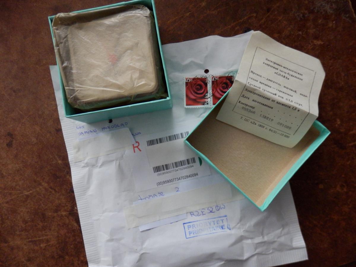 Ten budzik występuje w katalogu z 1993 r.Załączony do sprzedawanego egzemplarza druk jest uniwersalny dla różnych budzików SLAVA elektro-mechanicznych a tylko w dolnej części drukarką igłową dopisano model ( 955368 ) datę produkcji ( 091089) i jeszcze jakiś kod fabryczny, być może numer kontrolera. Model się zgadza, data produkcji również odpowiada czasowi produkcji. Jak dla mnie podważanie autentyczności budzika za 13 zł na podstawie gramatury papieru ustalonej na podstawie zdjęcia z aukcji jest dość zabawne. Można się jednak bawić dalej podważając właściwość  gramatury tektury użytej do produkcji pudełka , koloru papieru, który użyto do jego oklejenia i oczywiście przeźroczystości papierka zabezpieczającego przed wstrząsami.