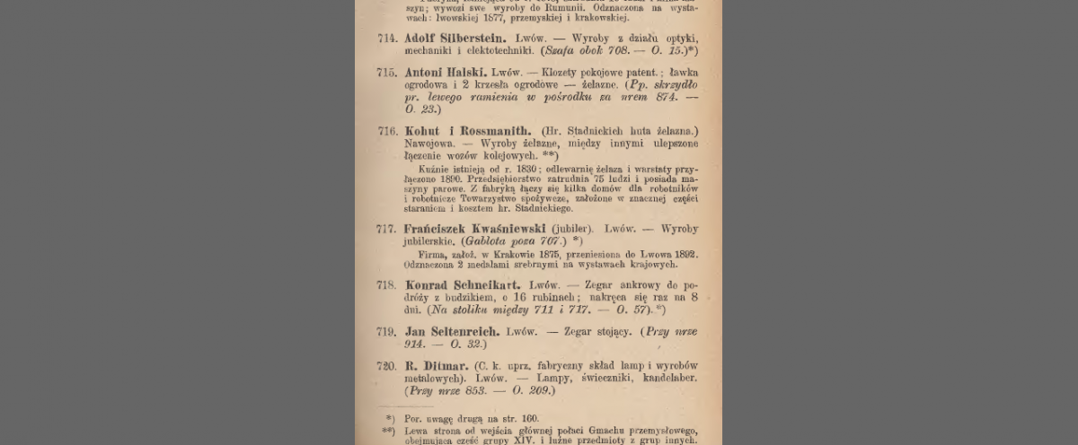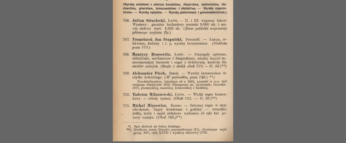 Ponadto na PWK w 1894 Tadeusz Miłaszewski ze Lwowa wystawiał „Wielki zegar kieszonkowy roboty ręcznej”. Czy termin „kieszonkowy” należy rozumieć w popularnym znaczeniu jako „nadający się do noszenia w kieszeni” (no ale jeżeli tak to dlaczego wielki?) czy też „używający techniki kieszonek” (jezeli takowa istniała).