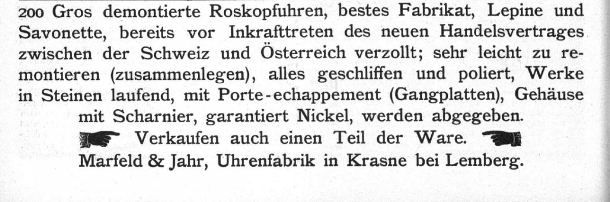 Z ciekawostek - reklama wyprzedaży mechanizmów kieszonkowych fabryki zegarów Marfeld & Jahr w miejscowości Krasne (?) pod Lwowem z roku 1906.