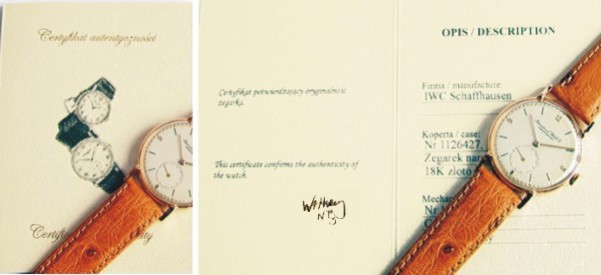 Szanowny Kolego, by nie przedluzac tematu, jakim jest "certyfikat autentycznosci" pragne li tylko powiedziec, iz przygladajac sie temu czemus nie trudno zauwazyc, iz nie posiada to cos pieczatek lub innych symboli ukazujacych osobe lub instytucje, ktora potwierdzila pochodzenie czy tez autentycznosc oferowanego przez Kolege zegarka. Moze dlatego, iz nikt powazny nie pozostawi swojego podpisu na czyms tak niepowaznym, jak zlozona w pol tekturka, ktora pretenduje do miana wyroczni o oryginalnosci zegarka tak szacownej marki, jaka jest IWC.