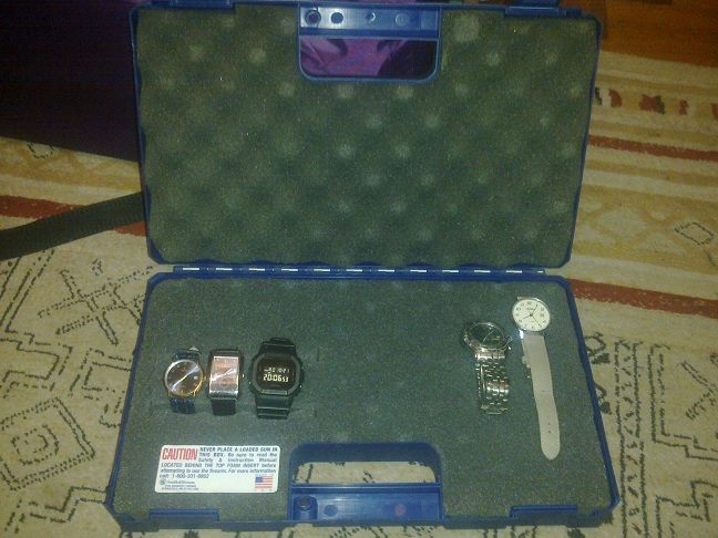 Jest to walizka po pistolecie ASG Smith&Wesson. Zegarki po lewej są zapięte na kawałku wyciętej pianki, a resztę spokojnie można kłaść luzem. Po zamknięciu górna pianka dociska dół i zegarki się nie przemieszczają. W miarę potrzeb dotnę sobie piankę na więcej zegarków gdyż jak wiadomo nie każdy leży na płasko jak ta Sława po prawej. Wizualnie szału nie ma ale są bezpieczne i wg mnie lepiej zainwestować w nowy zegarek niż kupować drogie pudełko. Tu wylądują zegarki które będą leżakować. Zegarki które noszę naprzemiennie pozostaną w eleganckim skórzanym pudełku na 5 zegarków.