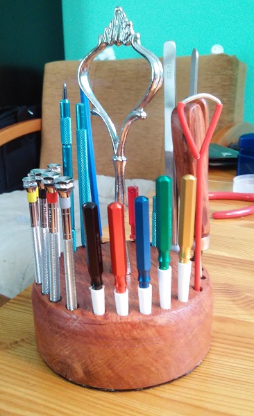 Właśnie twój stojaczek mnie zainspirował, tylko ja potrzebowałem więcej miejsc, więc kółko było by zbyt wielkie, i stąd pomysł na "kłodę" :)