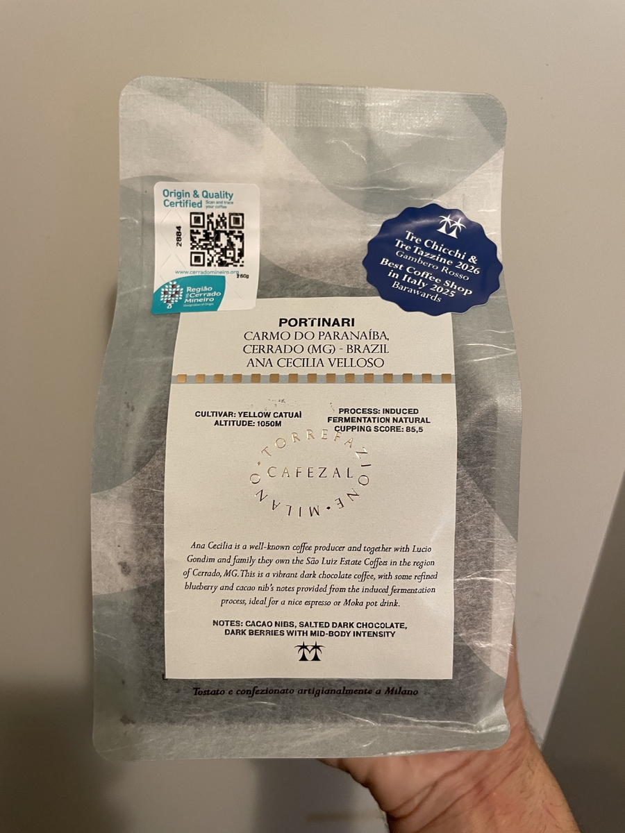 W końcu znalazłem u siebie sklep ze świeżo zmieloną kawą (we Włoszech to paradoksalnie wcale niełatwe, bo oni piją kawę hektolitrami, niespecjalnie dbając o super jakość). Zakupiłem takie coś. Próbowałem na miejscu; wydawało mi się nieco kwaśne, ale zaryzykowałem, bo uznałem że może moje plebejskie podniebienie nie rozróżnia aż tak dobrze dobrej kawy od przeciętnej. Następnego ranka zrobiłem cappuccino i dostałem pochwały że, cytuję „było pyszne”. Espresso jeszcze nie robiłem z tych ziaren, pewnie znajdę czas w weekend.