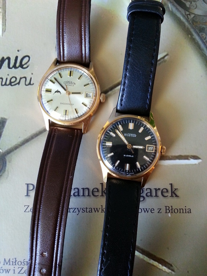 Co do indeksów i wskazówek to wydają się być faktycznie lustrzanym odbiciem jedynie tarcza Cornavina jest srebrzysta z promieniście rozchodzącym się wzorem. Nie wiem czy tak pomalowana czy polerowana natomiast w Wostoku tarcza jest malowana na czarno i nie ma tego efektu. Zegarki są bardzo podobne i w naprawdę fajnym stanie.