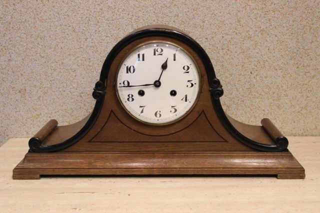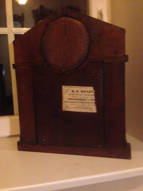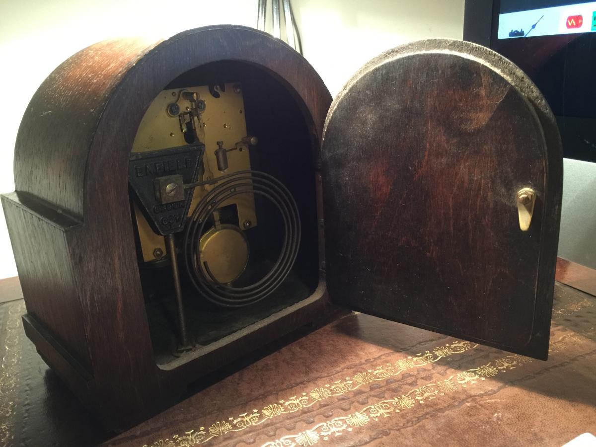 Nabyłem taki oto zegar. Z tego co wyczytałem jest to zegar Brytyjski firmy Enfield. Firma została wykupiona przez Smith, która również produkowała zegary. W środku widać wyraźnie, że produkowany jeszcze pod marką Enfiled, więc wnioskuję, że zegar wyprodukowany jeszcze przed 1950. Mechanizm działa i jest dokładny (+/- 10 sec/dzień). Mechanizm wybijania godzin i dźwięk raz na półgodziny. Jak na moje oko stan drewna jak i tarczy jest całkiem dobry. Przypuszczam, że nakręcenie wystarczy na około 8 dni, sprawdzam ;-).