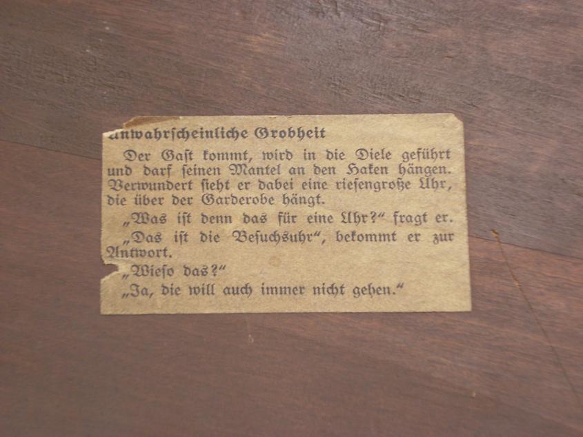 Na jednej z fotografii pokazana jest oryginalna kartka ,na ktorej napisano gotykiem cyt Tytul"NIEPRAWDOPODOBNE GRUBIANSTWO" Gość wchodzi,jest prowadzony do sieni i moze powiesić swoj plaszcz na wieszaku. Zaskoczony patrzy na olbrzymi zegar,ktory wisi nad garderobą. ,,Co to za zegar?"pyta ,,To jest zegar gościnny"otrzymuje odpowiedż ,,Jak to tak?" ,,Tak,ponieważ on rownież nie chce zawsze wychodzić."