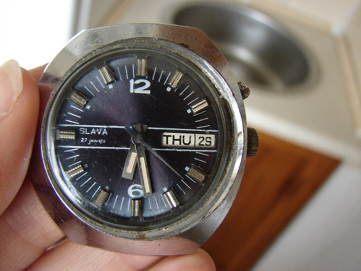 To SLAVA ( 27 jewels) z piękną fioletową tarczą, datownikiem po prawej stronie i samonakręcającym się podczas ruchów ręką mechnizmem.