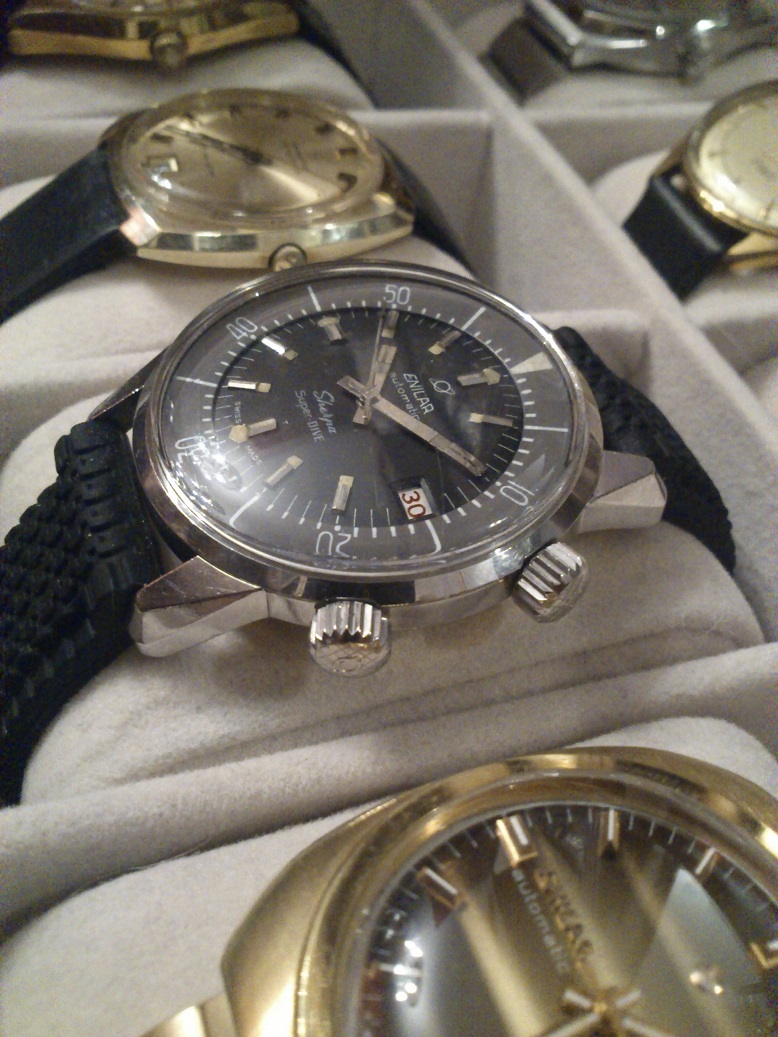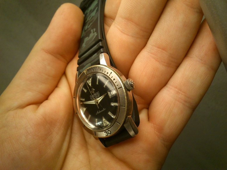 Wygląda na to ,że ktoś nieprawidłowo poskładał ten zegarek.,Wewnętrzny pierścień jest obrócony o 90 stopni.,Trójkąt który jest na 12 powinien być na 9,a napis TEMPS na godzinie 6 poniżej okienka datownika.,"Komplikacja" Meangraf polega na możliwości kalkulacji średniej prędkości i ten trójkąt z nieruchomego pierścienia pokazuje średnią prędkość na zewnętrznym obrotowym ringu.W zegarkach sprzedawanych w US na deklu była wygrawerowana instrukcja odczytu "AVERAGE HOURLY MILEAGE", "FRONT OF THE TRIANGLE",.No i moim zdaniem do nurkowania ten zegarek się nijak nie nadaje.,a nawet należy go zdejmować przy myciu rąk .