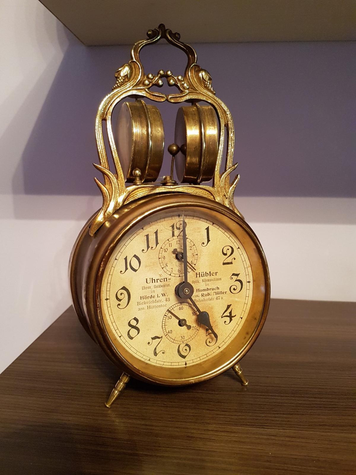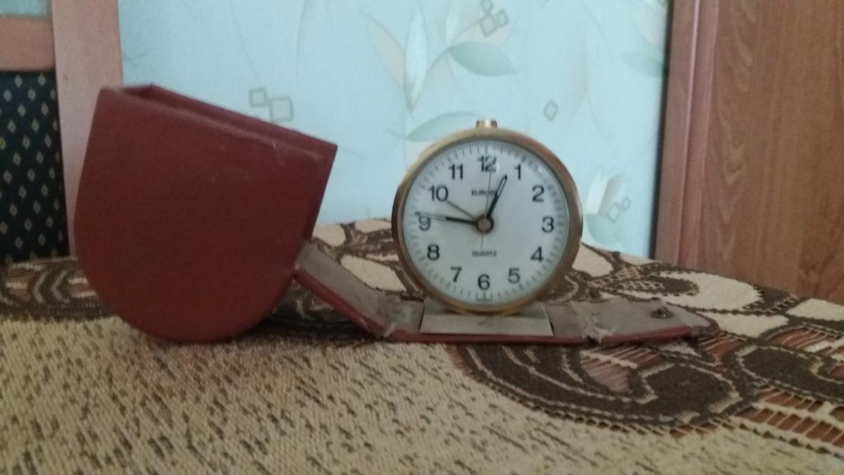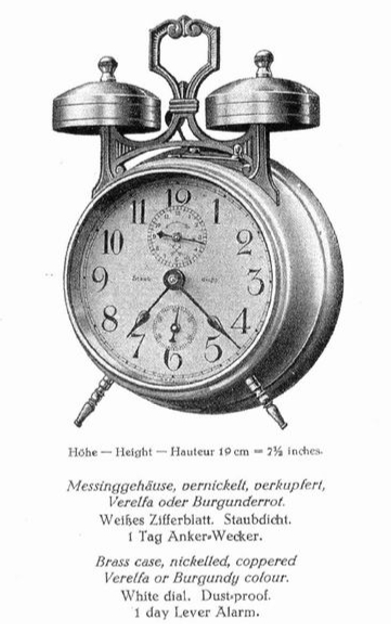 Budzik z okresu przejściowego od mechanicznych do kwarcowych. Obudowa wykonana z blachy mosiężnej. Etui kartonowe, oklejone płótnem introligatorskim.