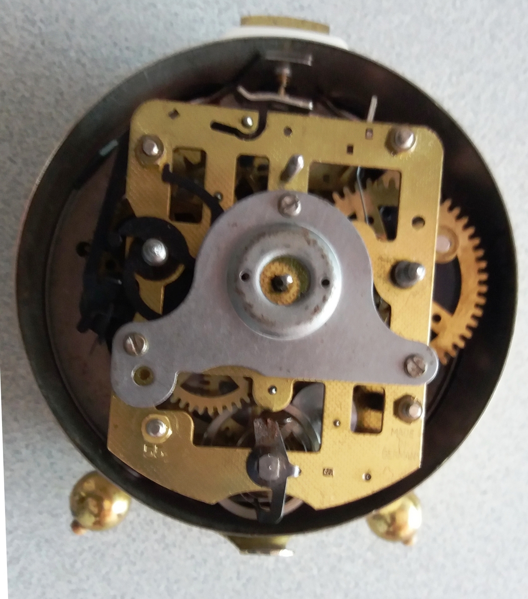 Mechanizm prosty ,a wręcz prymitywnie wykonany ,wszędzie nitowania i zaciskane elementy na stałe ,łącznie z paletami w kotwicy no ale działa 🙂Ciekawie rozwiązano demontaż przez poluzowanie trzech wkrętów mamy dostęp do mechanizmu a jednocześnie tarcza jest przykryta nadal szkłem zaciskanym w jednej ramce z tarczą.