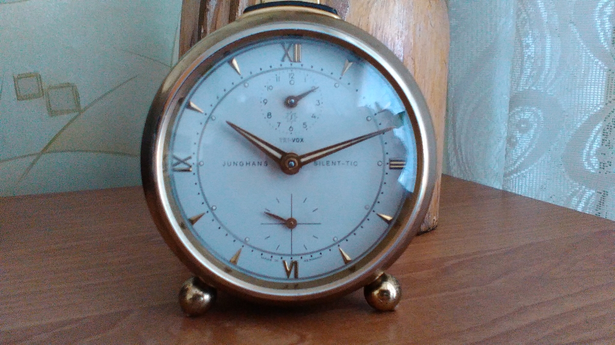 Jeden z nowszych nabytków, Jughans Trivox Silentic, przypuszczalnie z 1955 r. Kupiłem go na części. Brakowało koła balansowego, górnego łożyska, suwaka do regulacji włosa. Kołki kotwicy były wyłamane. Udało mi się go częściowo uruchomić. Ma jednak zepsutą blokadę koła budzenia.  Spróbuję w przyszłości to naprawić. Obecnie cieszy fakt, że ponownie odmierza czas. Tak się złożyło, że trzy lata temu kupiłem też model z identycznym mechanizmem. W ofercie Junghansa  ten z białą tarczą  od 1953 r.