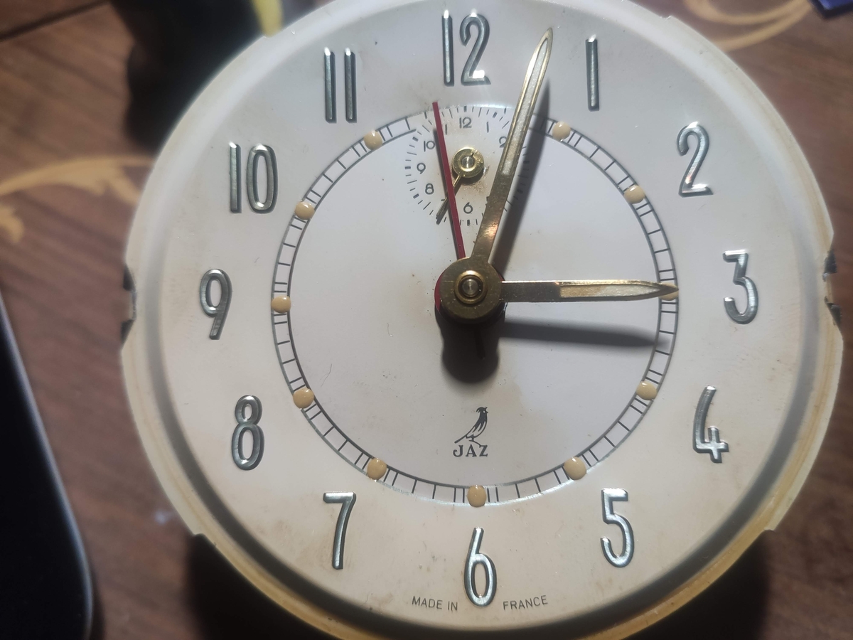 Specjalnie jakoś nie wyszukuję budzików francuskich ,no chyba że są tak ładne i starannie wykonane jak ten Jaz z centralną sekundą co zawsze mi się  podoba niezależnie od pochodzenia budzika😀 nie taki stary ,2 -1964r  ale widać że szanowany i zatrzymał się z...przesmarowania🙂poza tym bez ubytków