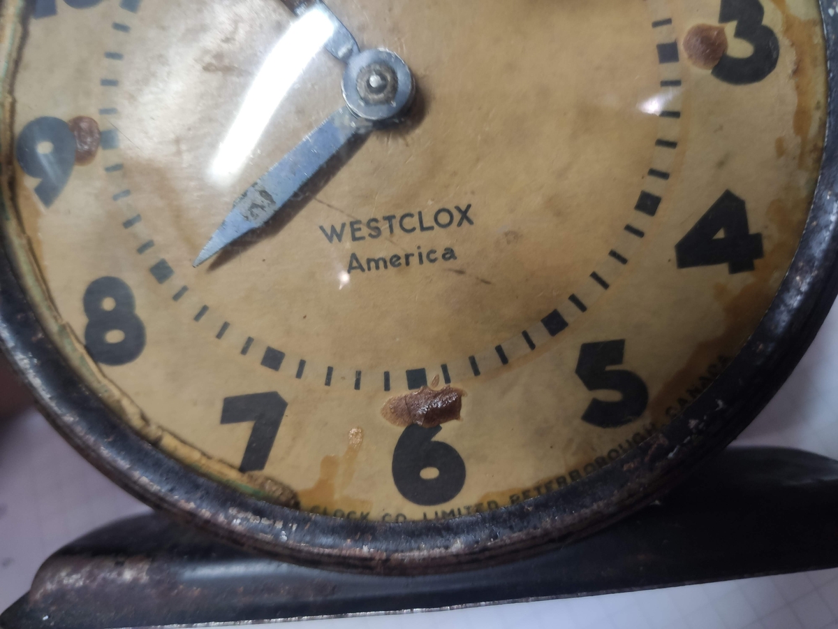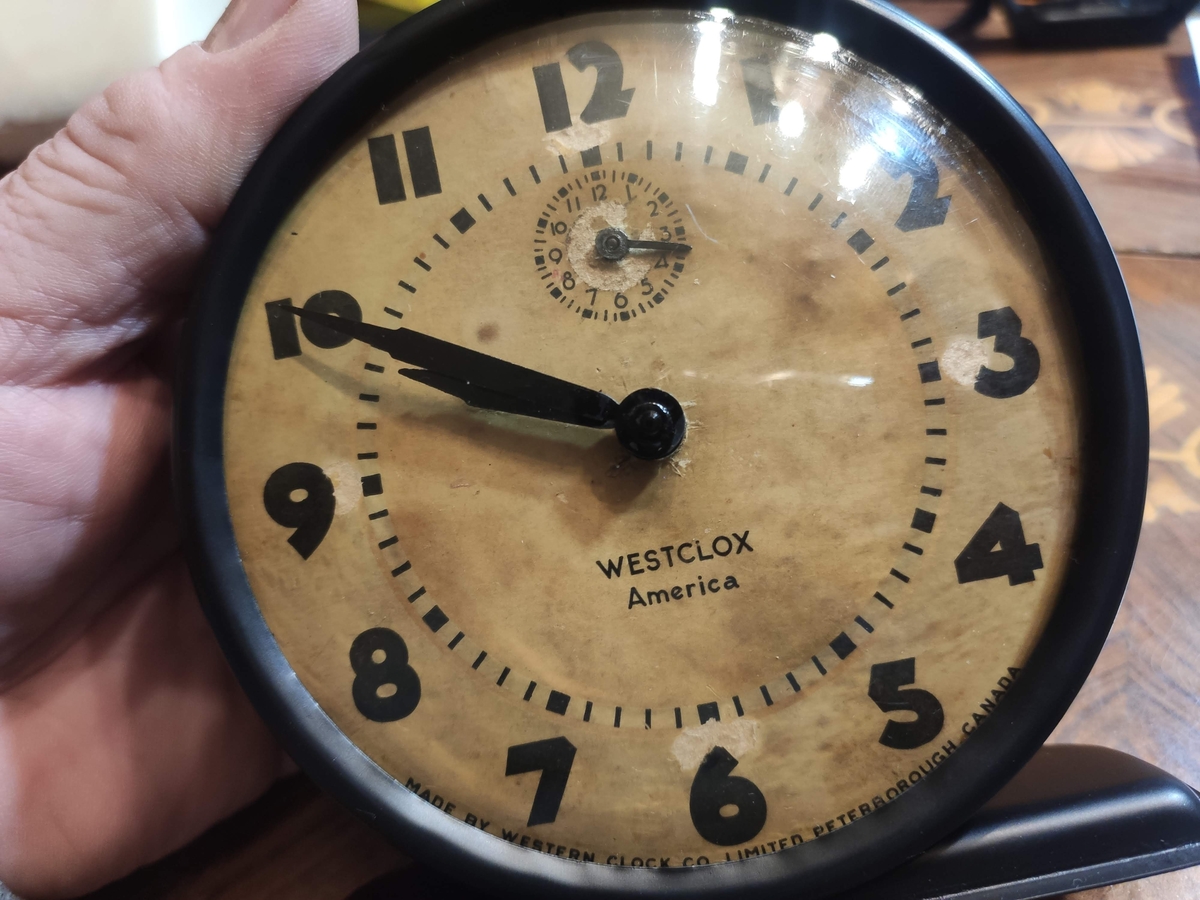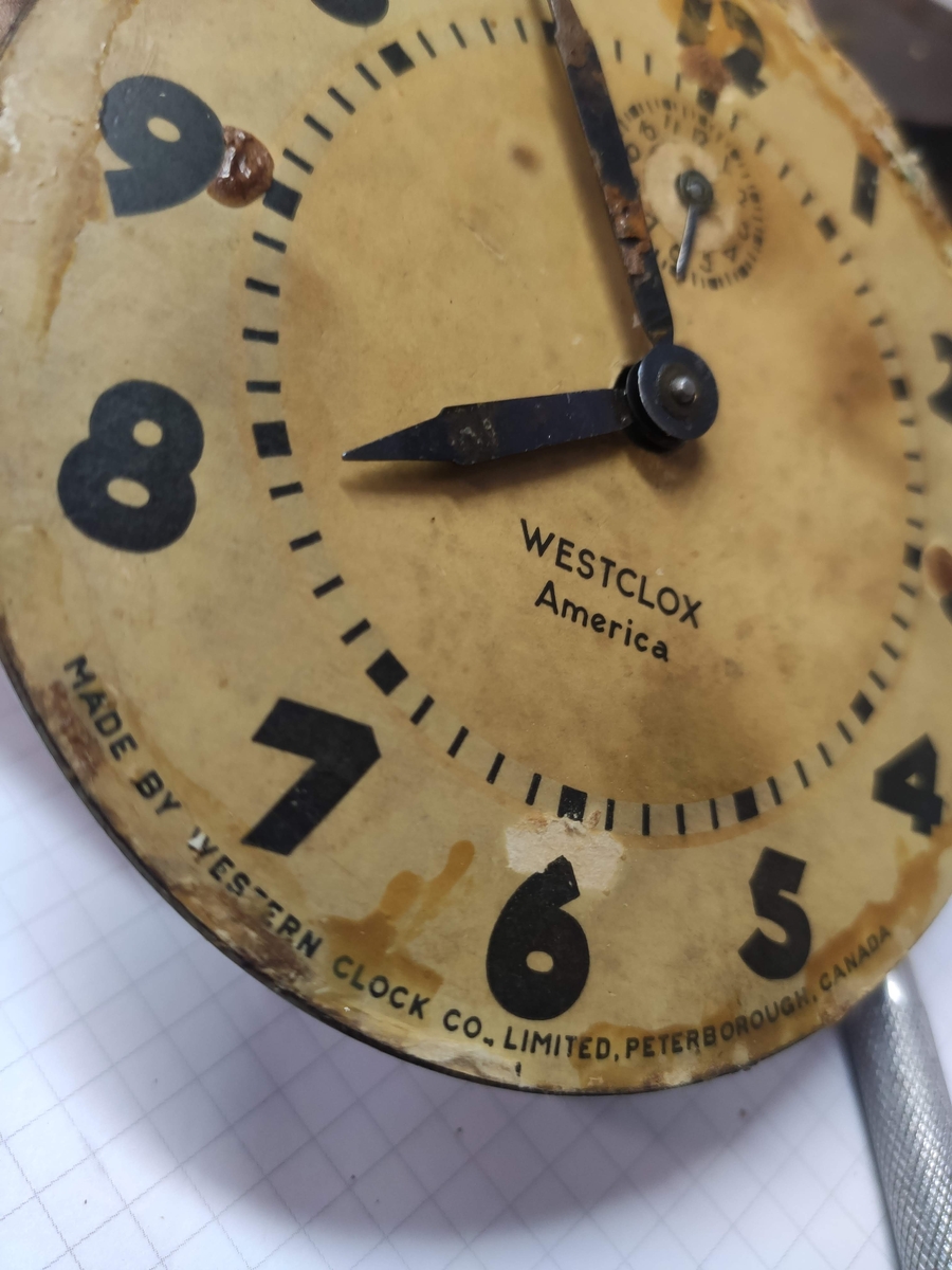 Do moich amerykanów dołączył Westclox America model 5 produkowany w Kanadzie od 42 do 48 r .Ktoś go mocno rozgrzebał i lepił i dlatego tarcza wygląda jak widać ,resztę jakoś wyprowadziłem i działa , chociaż lutowana kotwica z kawałków to mistrzostwo. Budzik bardzo prosty w budowie i naprawie a jednocześnie solidny .A że w kolekcji Westcloxów America musi być to szukam ciągle wcześniejszych modeli😃
