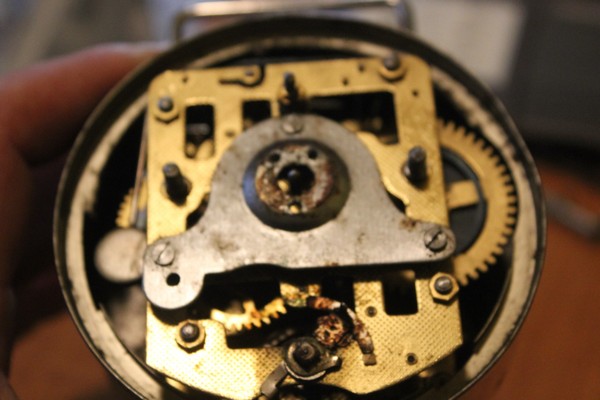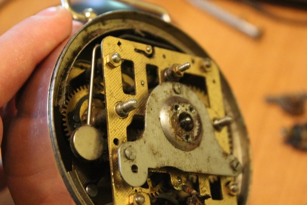 Niestety, jakiś laik próbował chyba na nim swoich sił zegarmistrzowskich, bo zegar jest w stanie agonalnym, co na kolejnych fotkach widać aż za dobrze. Zaniosłem już tego sympatycznego malucha do fachowca, ale wydaje mi się, że postawiłem go przed nie lada wyzwaniem.