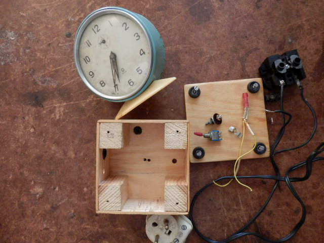 Dzisiaj kupiłem na giełdzie staroci budzik POLTIK przerobiony na włącznik ( lub wyłącznik) czasowy. Jest to przykład jak w czasach gdy występowały trudności w zakupie zwykłego włącznika czasowego radzono sobie z takimi problemami. Włącznik wyposażony jest we wtyczkę sieciową oraz w gniazdo wyjściowe , wyłącznik ramieniowy oraz diodę która ma chyba wskazywać podłączenie napięcia,  Obawiając się jednak czy nie zostanę porażony prądem nie włączyłem wtyczki do prądu i na razie ograniczyłem się do nakręcenia budzika - działa.