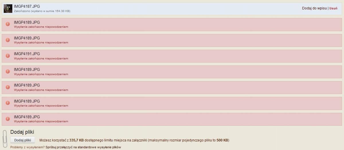Od czasu do czasu, mam kłopot z wstawieniem zdjęć do tematu. Dla przykładu dzisiejsza sytuacja. Pierwsza fota weszła, próby dodania kolejnej kończą się fiaskiem. Limit oczywiście nie przekroczony.