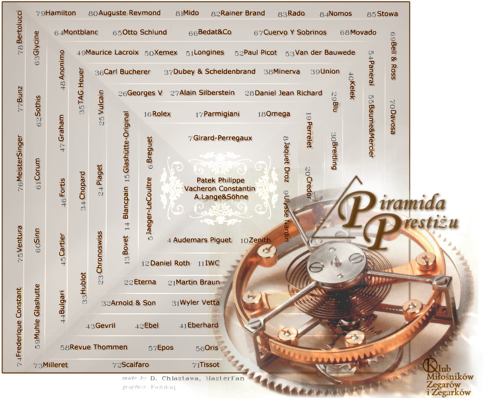 Ja mam jeszcze pytanie: jak będzie wyglądała ta skrócona wersja Piramidy :?:. Bo jeżeli chcecie ograniczyć liczbę firm, prezentując Piramidę (przykładowo) od miejsca 1 do 40, to zabraknie kilku istotnych marek natomiast zostaną ujęte te, które dla wielu osób są całkowicie anonimowe. W Piramidzie Prestiżu mielibyśmy wówczas Wyler Vetta, Georges V, Martin Braun, a zabrakłoby takich firm jak Eberhard, Cartier, Longines czy Maurice Lacroix.
