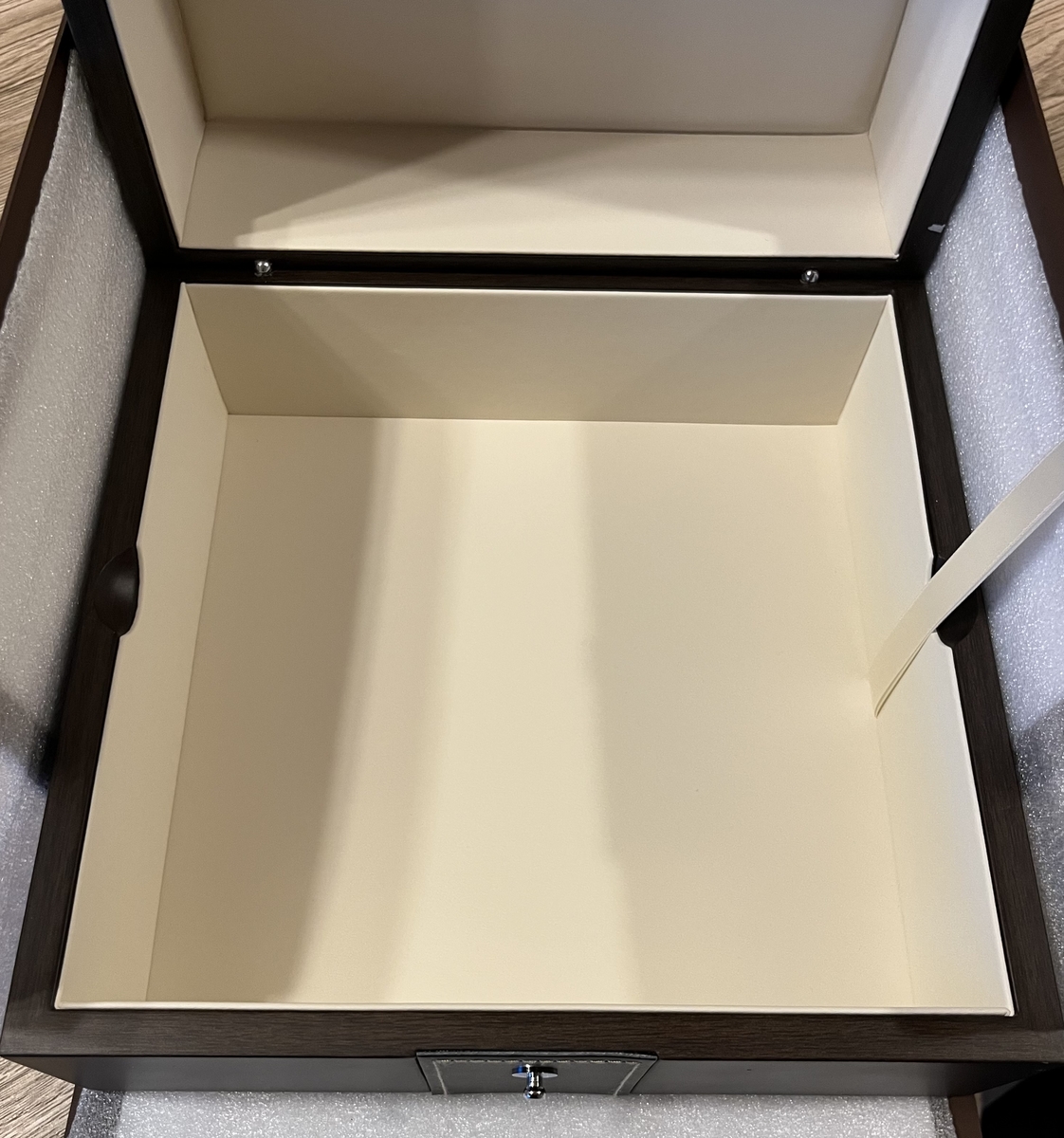 W środku niewiele mniejsze drewniane pudło ze skórzanymi elementami, a w nim centralnie umieszczony zegarek, pod nim błyszcząca tabliczka z wygrawerowaną nazwą modelu.