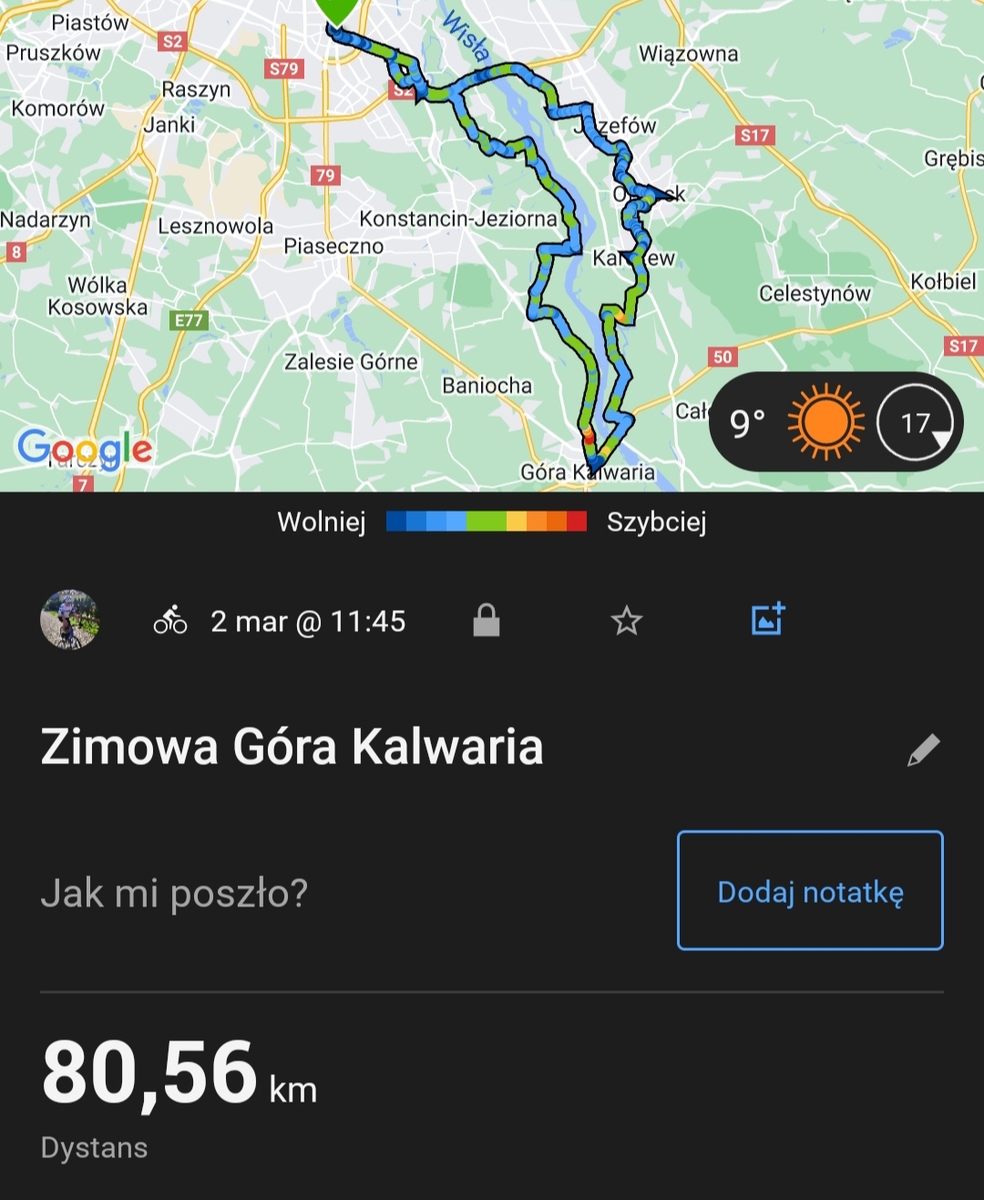 Debiut na nowej ramie i przy okazji pierwsza w nowym sezonie setka pękła 😉 Do tego relatywnie sporo (jak na płaskopolskę) przewyższenia... W grupie było paru młodych, ambitnych i ścigających się, więc ...momenty były. Do podniesienia sztyca, no ale to zawsze wychodzi dopiero w czasie jazdy.