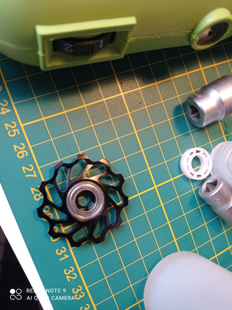 Łożysko osadzone, nie było łatwo bo kółko ma otwór jak dokładnie sprawdziłem o 6 setek mniejszy, a prasy nie mam, ale ostatecznie po użyciu mini szlifierki weszło, luzów osiowych nie stwierdziłem. Na starych kółkach jest i osiowy i promieniowy a na tym niby ceramicznym łożysku jest luz osiowy.