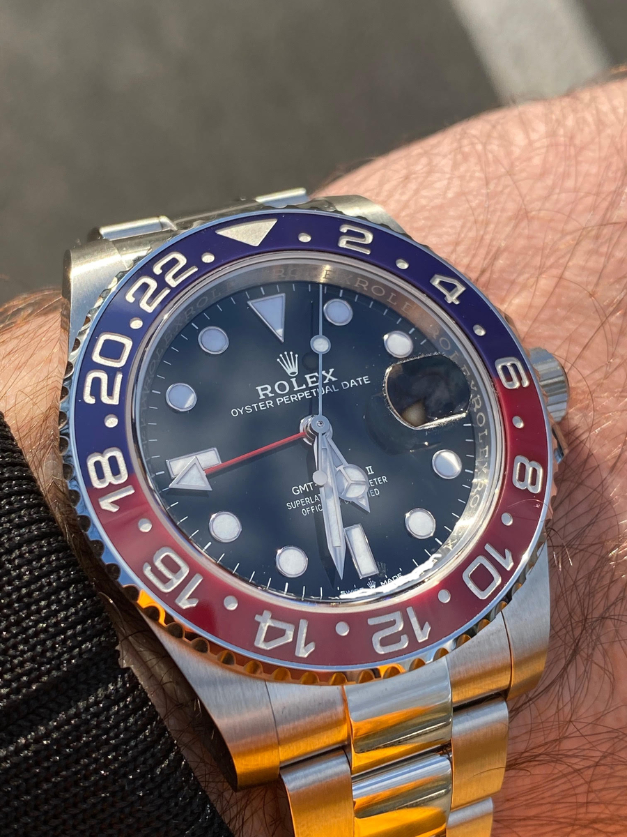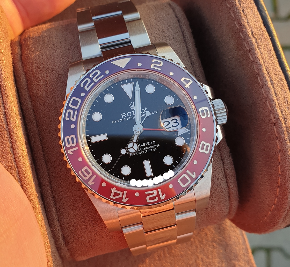 O dziwo zaraz po wzieciu do reki Pepsi na Oysterze (dalej bede uzywac skrotu PO a dla jubilee PJ) zwrocilem uwage na to, ze bezel jest jakby ciemniejszy. Bylo to o 18.00 przy swietle dziennym gdzie za oknem jeszcze jasno i nie mialem jeszcze przy sobie PJ, wiec pomyslalem, ze mi sie tylko wydaje. Jednak pozniej, gdy juz na spokojnie moglem wyjac i porownac bezposrednio z wersja na jubilee... zdziwilo mnie to, ze moje przypuszczenia sie potwierdzily - granatowy w PO jest głęboki a bordo jakby ciemniejsze (bardziej przydymione). Ale ok - wolam zone i syna i pytam o zdanie - jednoznacznie bez wahania wskazuja, ze PJ jest jakby bledsze i "mniej granatowe" niz PO. Ogladalismy pod roznymi katami i zarowno w swietle dziennym jak i domowym oswietleniu i jak nie patrzec - różnią się 😎 Nie jest to jakas przepasc, jednak PJ czesciej pod roznymi katami blednie lub zaczyna wpadac w fiolet niz PO. Bordo rowniez jakby "mniej malinowe", jednak na niebieskim widac to bardziej. Wyglada to mniej wiecej tak, jak na zdjeciu nr 1.