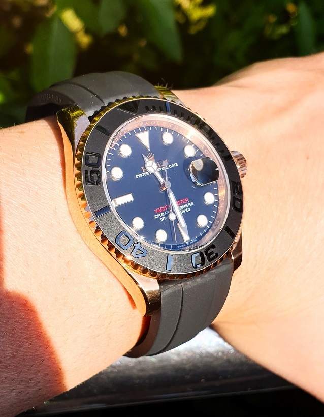 Ja właśnie taki wczoraj oddałem (jeśli to 40 mm w "różowym") - na prawie trzy miesiące znajomy zostawił mi do ponoszenia i powiem tak: sam zegarek super, chociaż w mocnym słońcu jakiś taki mało czytelny. Dodatkowo oysterflex mnie wkurza, w standardowym rozmiarze na moim 17 cm nadgarstku, maksymalnie zmniejszony na glidelocku był na granicy akceptowalności, wolałbym mieć możliwość zmniejszenia chociaż o jeszcze jedną "dziurkę". Zegarek niby trzyma się w miarę ok, ale jednak przez te "sprężyny" w gumie przy uchach guma wygląda jakoś pękato na nadgarstku. Plus skrzypi przy zakładaniu😜