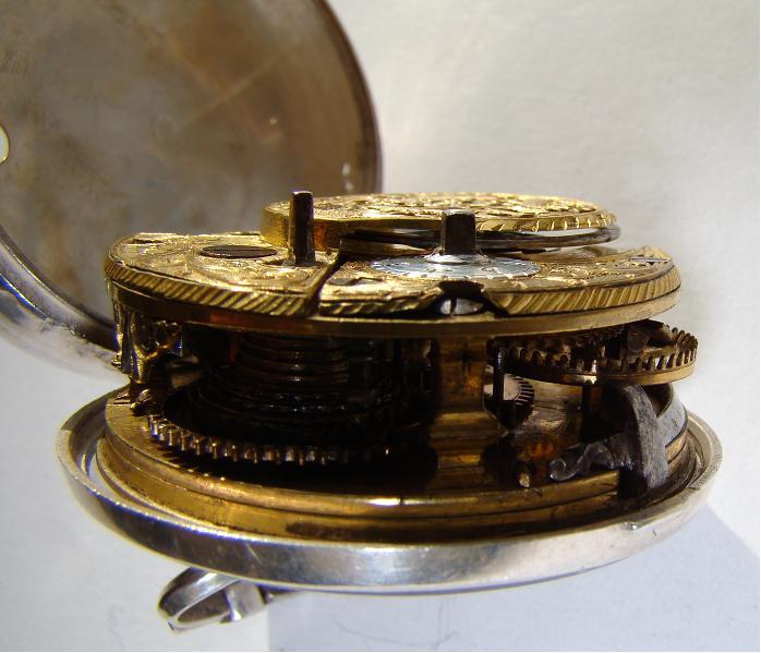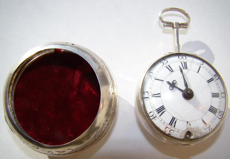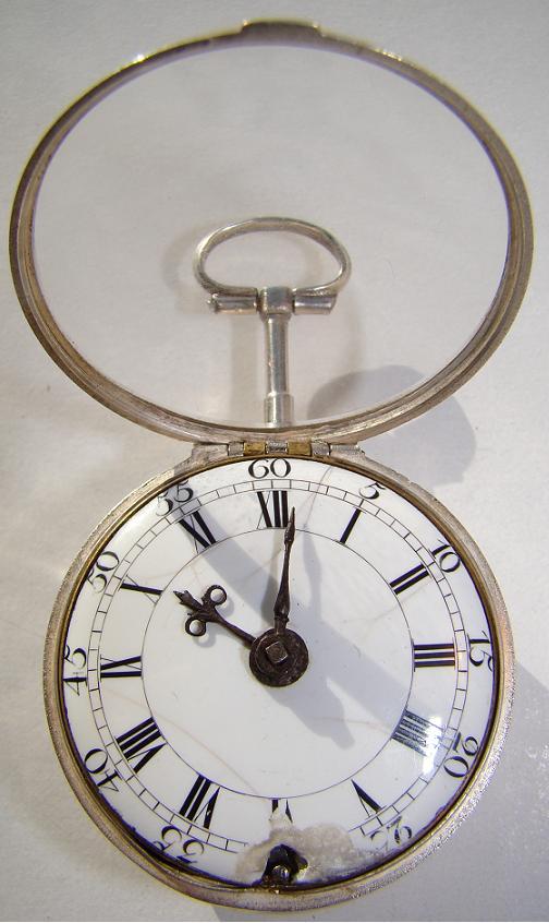 Ostatnio stałem się posiadaczem takiego oto zegarka. Mechanizm  jest w świetnym stanie, tyka mocno i głośno. Nieco gorzej jest z kopertą, nosząca ślady napraw, a zewnętrzna koperta jest w dosyć kiepskim stanie, wytarta do tego stopnia, że ktoś wzmacniał ją w środku lutem z cyny. Trudno nawet określić co przedstawia scena na jej deklu. Moje poszukiwania w sieci, aby cokolwiek się o nim dowiedzieć, dały niewiele. Jaki jest rok produkcji? Podobnie wyglądające zegarki produkowane były zarówno w pierwszej, jak i w drugiej połowie XVIII w. Punce w zewnętrznej kopercie (jeżeli są) zalane są cyną, a z punc na kopercie zegarka nie wiele mogę wyczytać, poza leopardem w koronie po lewo i chyba lwem na górze. Są też litery (chyba TS i jakiś znak nad nimi), ale nic na temat producenta koperty nie udało mi się znaleźć. Także nie natknąłem się na osobę zegarmistrza, imię chyba Abraham?