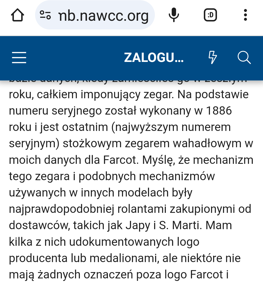 JASI 1218 #253 Napisano 6 Lipca 2024 (edytowane) W dniu 5.07.2024 o 14:40, erzlot napisał(-a): Byłem całkowicie przekonany, że jest to Farcot Nie jestem ekspertem, ale jakiś czas temu zagłębiłem się dość mocno w temacie Farcota. John Hubby na NAWCC dosyć precyzyjnie określa datę powstania zegarów Farcota. Obiecał opublikować tabelę datowania, ale jeszcze nie ujrzała światła dziennego. Twoje zdjęcie mechanizmu jest kiepskie. Wg Johna Hubby byłby to rok 1881. Zegar z numerem 462xx datował na koniec 1881 roku. Słabo widać, ale na Twoim mechanizmie jest sygnatura Farcota. A tu zegar podobny do Twojego. Tyle, że ten jest z mechanizmem Farcota. John Hubby podaje, że Farcot stosował też mechanizmy zakupione od Japy i Marti. Niekiedy sygnowane przez niego własnym logo, posiadały też logo producenta. Jednak nie zawsze, bo były też Japy czy Marti bez ich logo, a sygnowane tylko przez Farcota. Tu cytat Johna Hubby. Dorzucę jeszcze zdjęcia mechanizmów innych producentów z logo Farcota. Wobec powyższego śmiem stwierdzić, że Twój zegar to Farcot, ale na mechanizmie innego producenta. Pozdrawiam Jacek PS Link do NAWCC. https://mb.nawcc.org/threads/post-your-farcot-clocks-here.20858/page-9 Edytowane 6 Lipca 2024 przez JASI 1 "Na żadnym zegarze nie znajdziesz wskazówek do życia" Udostępnij tę odpowiedź Odnośnik do odpowiedzi Udostępnij na innych stronach